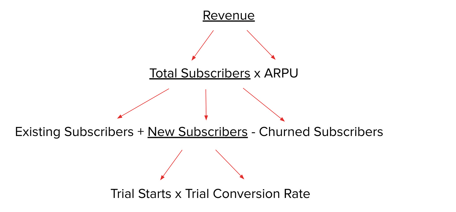 Let's take a look at a quick example of this for a SaaS business with free trials. You're ultimately trying to maximize revenue, so that's your highest level outcome metric. But the reality is that revenue is a trailing measure, since by the time you notice a change in your revenue, the actions you could have taken to effect it were weeks if not months prior. Instead, we want to get to leading indicators that help us understand what's going on a lot earlier in the user journey. So let's get to work breaking revenue down to it's sub-metrics. We start with dividing it into paid subscribers times ARPU (average revenue per subscriber). You can then further break down paid subscribers into existing subscribers + new subscribers - churned subscribers. New subscribers can be further broken down into trial starts times trial to paid conversion rate. You can keep going down to acquisition metrics, including trial starts by acquisition source. ARPU can similarly be broken down into ARPU per plan type and the percentage of users purchasing each plan type. I hope this gives you a sense of how to go about modeling your business. You can perform a similar exercise for your own business, regardless of whether it's SaaS, consumer, e-commerce, or something else entirely.