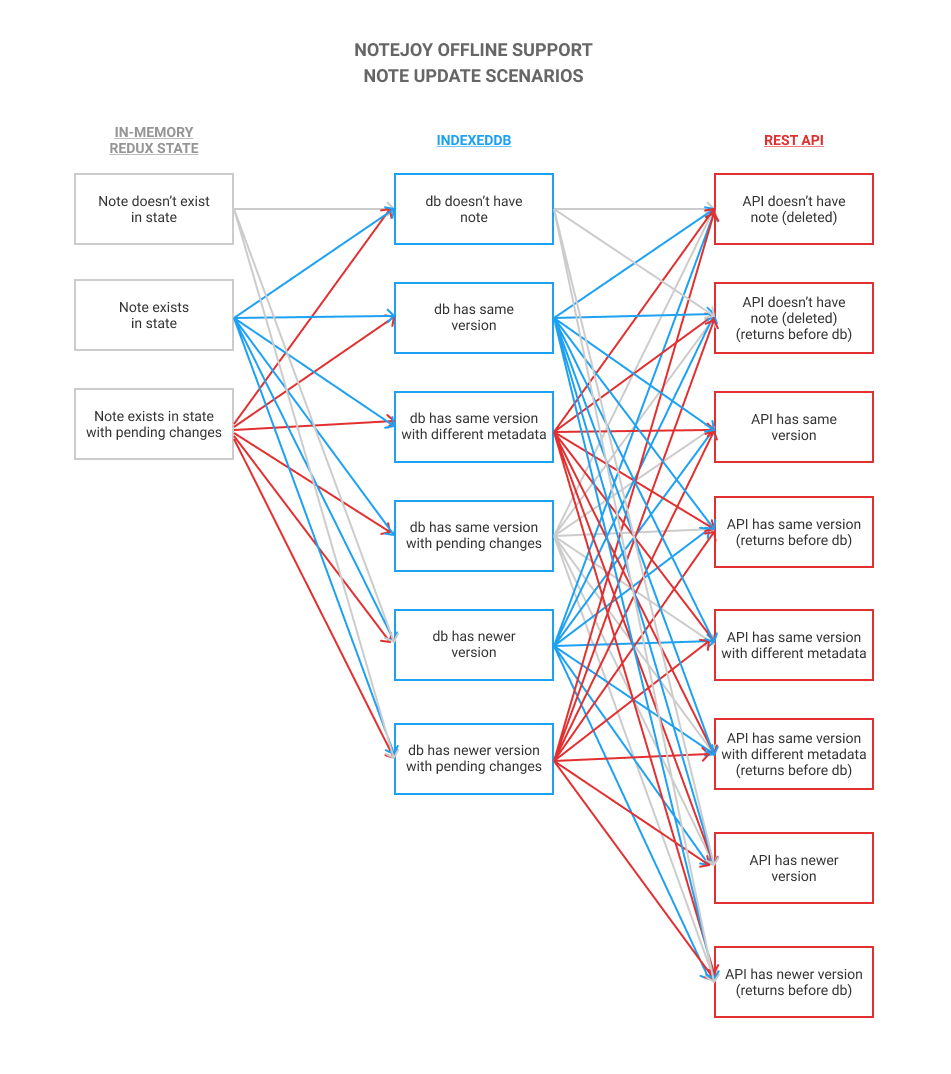 This gets more complicated as we start to introduce edits into the mix. Let's start with the simple case of edits made by someone else that are stored in Notejoy's servers. Along with storing a note's content, we also store a monotonically increasing version number that increments with each note edit. Now instead of simply checking whether the note exists in-memory, in IndexedDB, or when we make an API call, we also compare the version number. So when you click on a note, we first attempt to load the note from our Redux state, if it exists there. We then make simultaneous calls to IndexedDB and our API. When each of those requests returns, we compare its version number to the version number we currently have loaded and if the version number is higher, we replace our current version with the newer one.