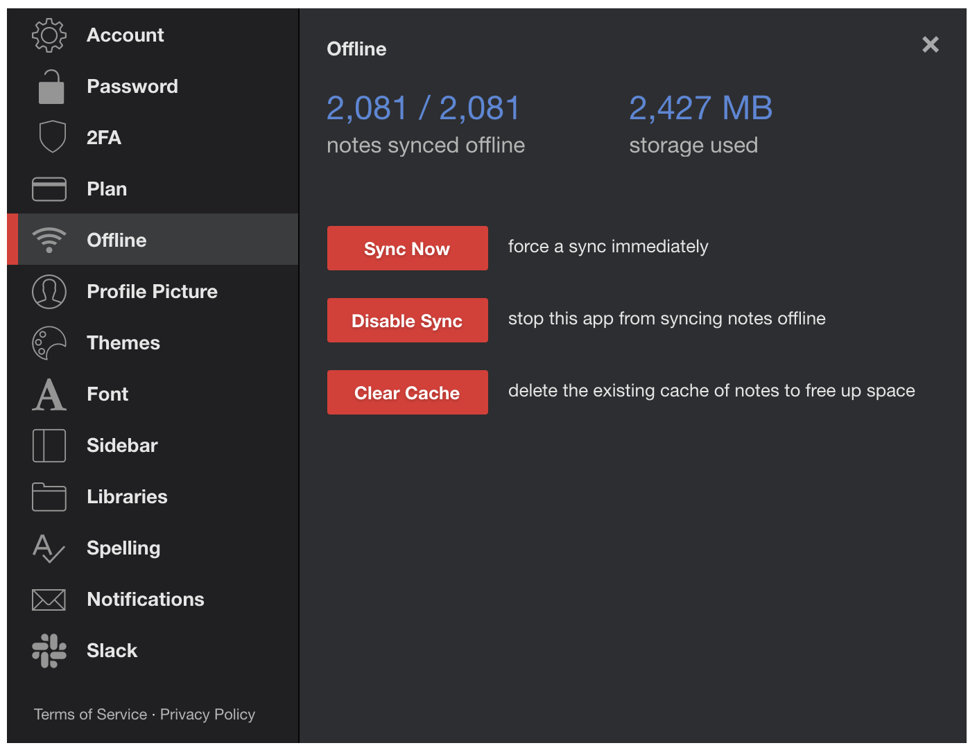 Users can go to our Offline sync settings page to see the status of their sync, enable or disable sync, or clear local storage to free up space. But they never actually have to do that. We don't put a sync button front and center in the app, because it all happens seamlessly behind the scenes. Since anytime you view a note, we are also downloading it to your device, you know that any notes you've recently viewed are already synced. The background sync is always running and downloading any notes that have been modified to keep your local device up-to-date. But even if you end up in a situation where you are editing an old version of a note, our operational transformation conflict-free sync resolution mechanism ensures those edits get applied appropriately to the note anyway. We've thus accomplished our goal of an intuitive but powerful offline experience.