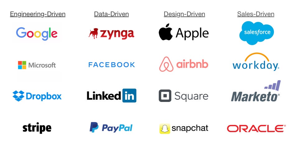 Through my time in Silicon Valley, I've found four specific product cultures dominate tech companies: engineering-driven, data-driven, design-driven, and sales-driven product cultures. Individual companies typically have a dominant product culture, plus elements from a secondary product culture. Lets walk through exemplary companies in each category and the key facets of each culture.