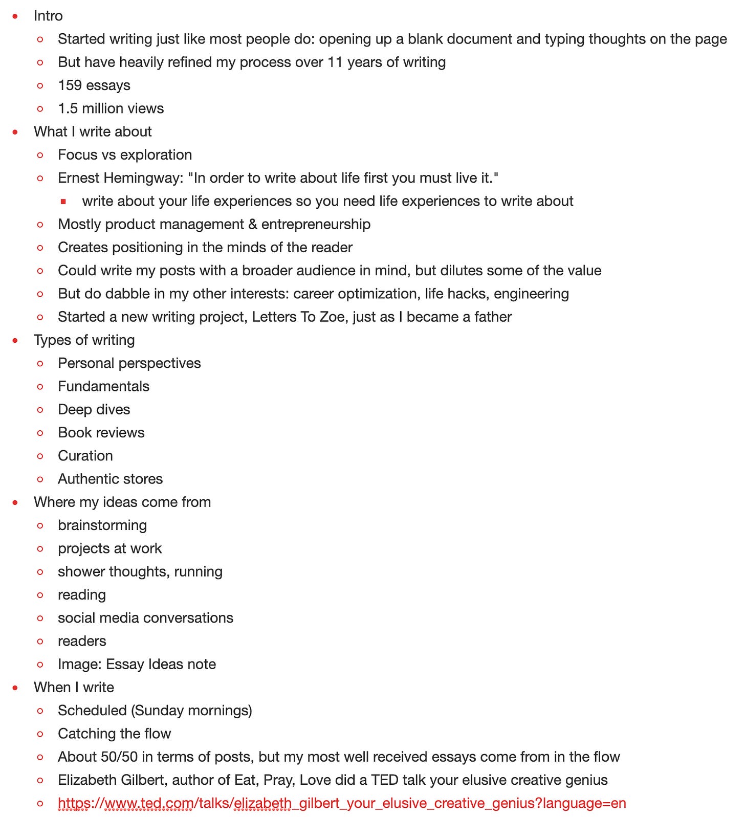 When I started writing 11 years ago, I did so the same way most people do: by opening a blank document and typing my thoughts on the page. But each year since then I've subtly refined and evolved my process in an attempt to improve the quality of my writing and its impact. Now with 150+ essays published with over 1.5 million views, I wanted to share every detail of my writing process for fellow or aspiring writers who might benefit from it.