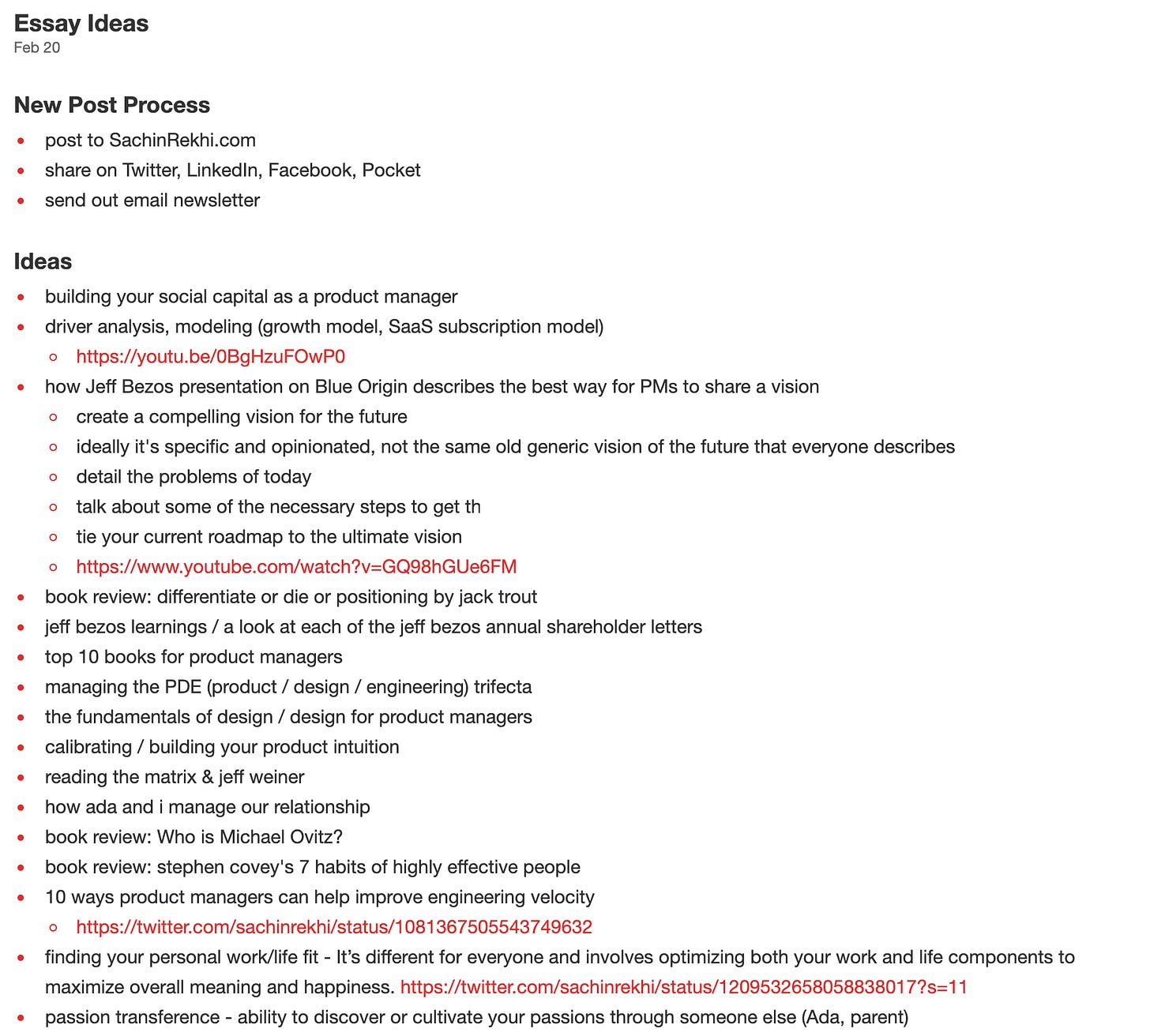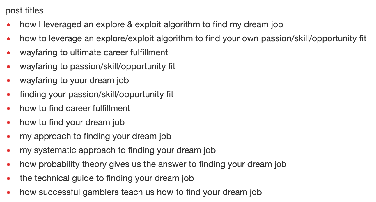 All that being said, I do have interests beyond product and entrepreneurship and I have taken the opportunity to dabble in those interests purely out of enjoyment. The remaining 15% of my essays cover everything from career optimization to life hacks to engineering.