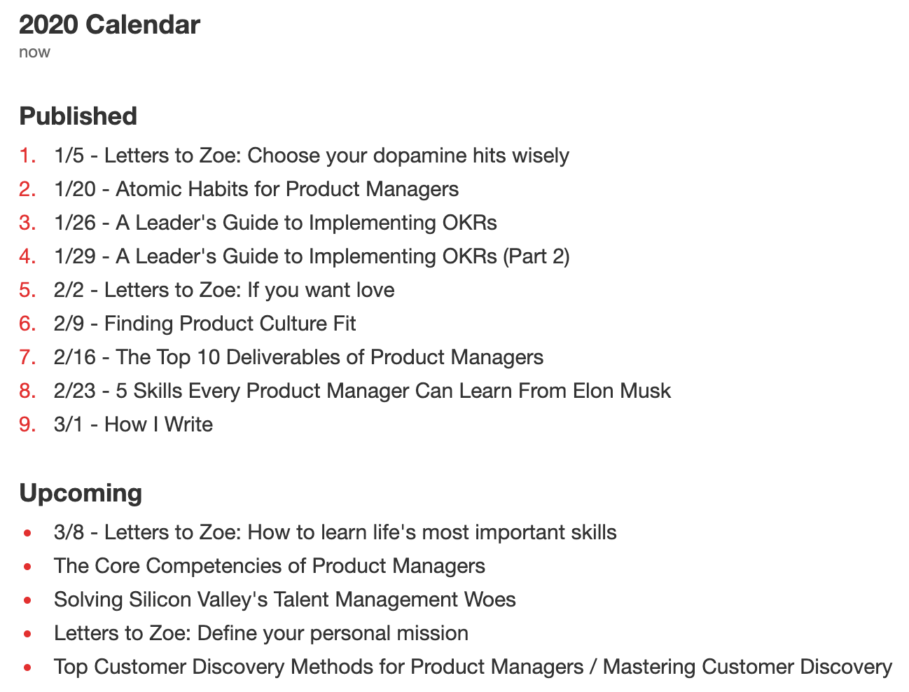 When I started writing I used to simply publish an essay as soon as I had finished it. But over time I experimented with various publishing times to try to come up with the optimal time for maximizing readers. That time has changed over the years but currently I'm finding Sunday evening to get me the most consistent results. I also don't publish more than one essay a week. But sometimes, due to fits of inspiration, I might actually author two essays in the same week. Because of this, I maintain a simple content calendar that tracks essays I've published for the year, upcoming essays that have been written, as well as essays I plan on writing.
