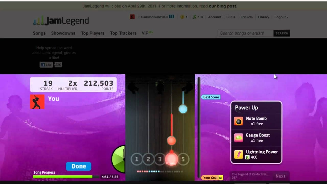 JamLegend is best described as a web based version of Guitar Hero. Not only have they done a great job of recreating the fun of Guitar Hero on the web and your computer, but they've opened up the opportunity for very interesting web-based additions. One exciting opportunity for them is continuing to build out their massively multi-player capabilities, tournaments, and leaderboards. At the same time the ability to eventually crowd-source all the tracks and build the largest library of playable content will be key. JamLegend could become the newest form of music promotion for artists and both indie and major label artists will be looking to take advantage of this latest phenomenon.