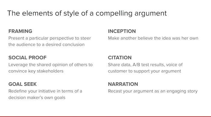 Let's now drill into what I like to call the elements of style of a compelling argument. I'll go through six styles here, but keep in mind this is just a shortlist of some of the most effective styles I've leveraged but there are dozens of more ways to make a compelling argument.