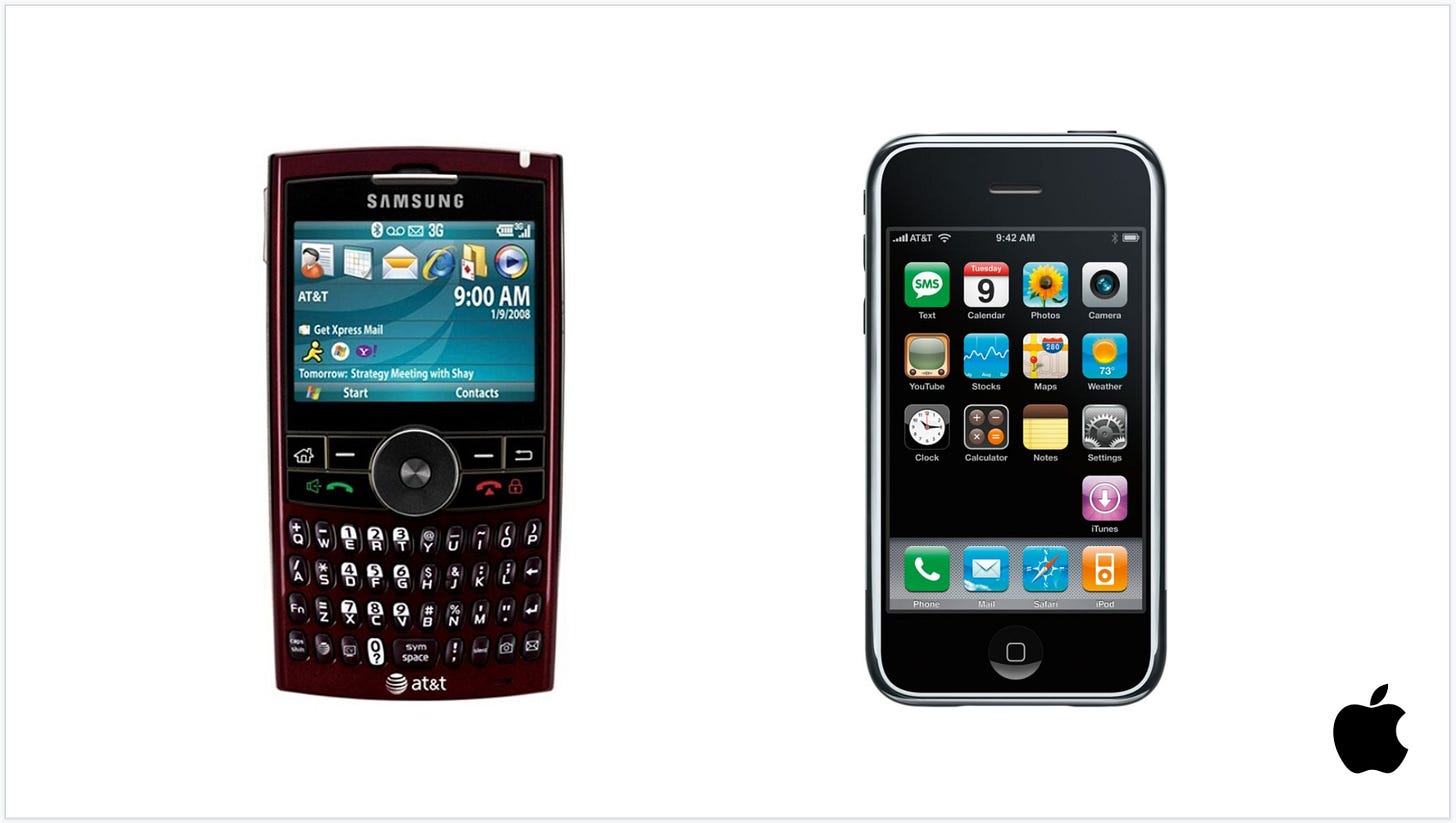 The canonical example of significantly reducing interaction friction remains the iPhone. Everyone knows that smartphones existed before the iPhone. We remember the days of the Blackberry or Windows Mobile devices that were technically email and web capable devices with a keyboard. And yet the iPhone changed everything. It was the first device to have a highly accurate on-screen keyboard thanks to their innovation in capacitive multi-touch screens. This freed up significant real estate on the screen when you weren't typing. They packed enough CPU power on the device to support a full web browser instead of the extremely limited web experiences that existed on smart phones before it. And most importantly, they made the entire software experience extremely intuitive, beautiful, and fast. And these improvements to the overall UX significantly reduced the interaction friction of every prior generation of smartphones and laid the groundwork for this new class of smartphone to become the predominant mobile device that everyone now carries around in their pockets.