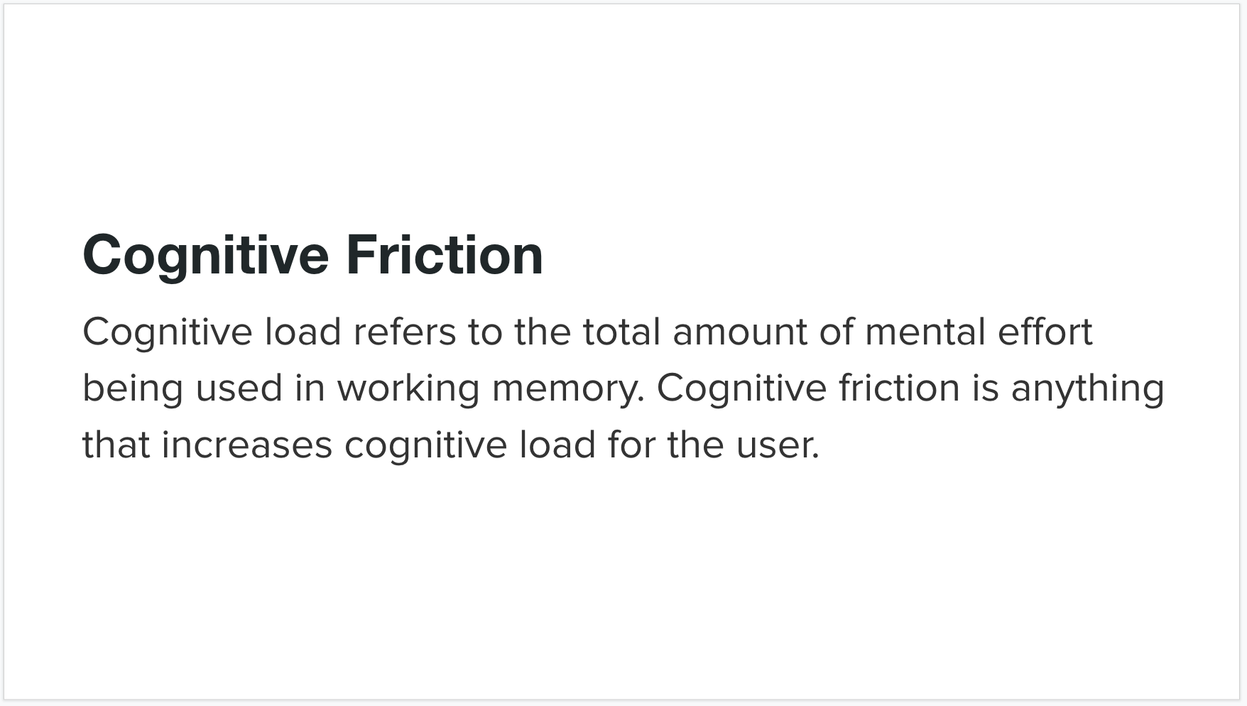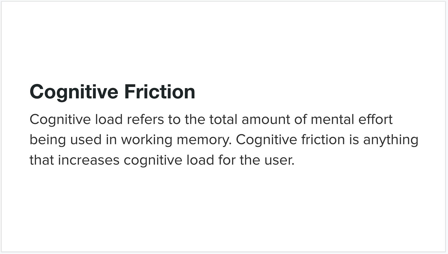 Cognitive load refers to the total amount of mental effort being used in working memory. When cognitive load is high when performing a task, it means there is significant cognitive friction. The product designers goal then becomes minimizing cognitive friction. Cognitive friction is broader than just interaction friction as it encompasses all aspects of the experience that result in mental effort. This is best illustrated through a set of examples.