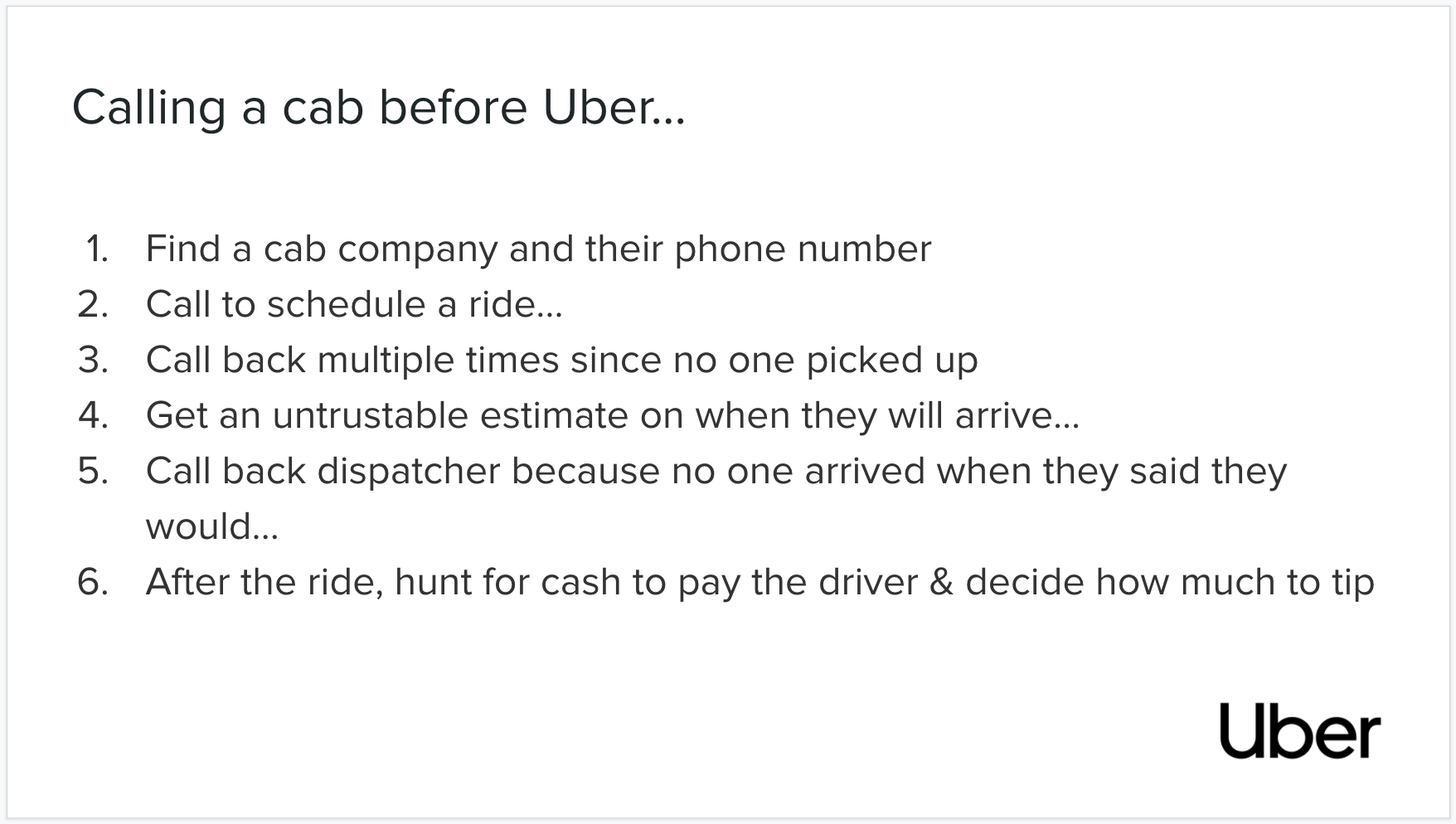 Uber has been incredibly successful not only because it delivers rides at a lower price, but it significantly reduces the cognitive friction previously associated with taking a taxi, bus, or really any form of public transportation. Previously when you wanted to take a taxi, for example, you'd have to find a cab company and their phone number. Then you'd call to schedule a ride and often be stuck calling a few times until the dispatcher took your call. Then they'd tell you they are sending someone but you could never really trust their time estimate, so you'd often call the dispatcher back just to make sure the taxi driver is coming. This resulted in significant anxiety around whether you would get to your destination on time. You'd then get in the taxi and be wondering how much the ride was even going to cost you and at the end of the ride have to deal with paying with either cash or credit and tipping the driver. Uber solved all of the cognitive friction throughout this user experience by creating an incredibly simple app to request a ride, get an accurate estimate and real-time details of how far your driver was, provide a detailed price quote, and make payment completely frictionless so you can just walk out of the car.