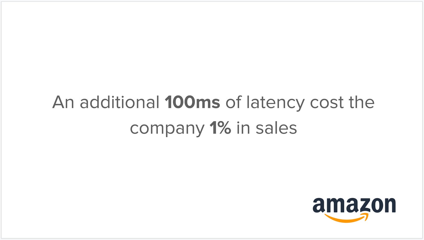 While the iPhone example illustrates how an entire industry can be redefined by solving for interaction friction, Amazon provides an example of how even the simplest of interaction friction can be a huge detriment to user experience. Amazon illustrates the incredible importance of site speed to online experiences. They found that they could increase revenue by 1% for every 100 ms of load time improvement. Think about that for a minute: such a small change in load time, 100 ms, could have such a dramatic impact on revenue for Amazon. It's a strong reminder that any type of interaction friction, especially page load time time, is important to address.
