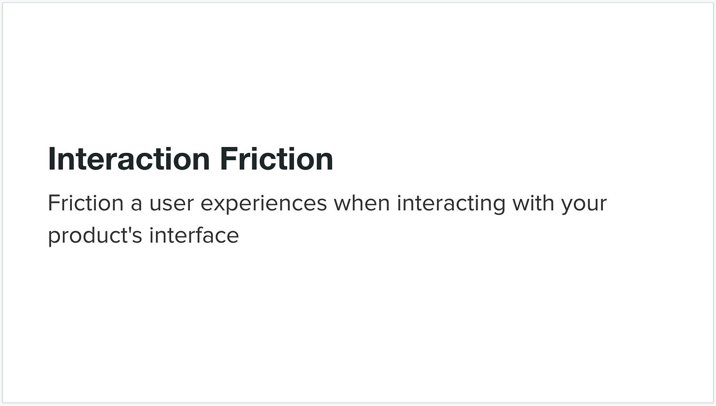 Interaction friction refers to friction a user experiences when interacting with your product's interface. It covers all aspects of the UI that may be hindering your users from accomplishing their goal.